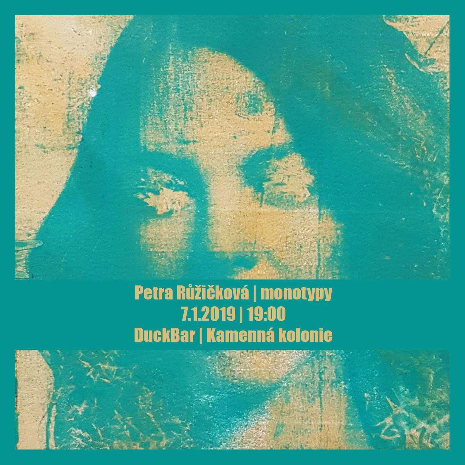 Petra Růžičková je absolventkou ateliéru Tělového designu brněnské FaVU. V současné době se věnuje především volné grafice. Vystaven bude soubor monotypů - experimentálních tisků z plochy bez použití lisu, u kterých využívá mechanického přenosu fotografií. Výstava je prodejní.