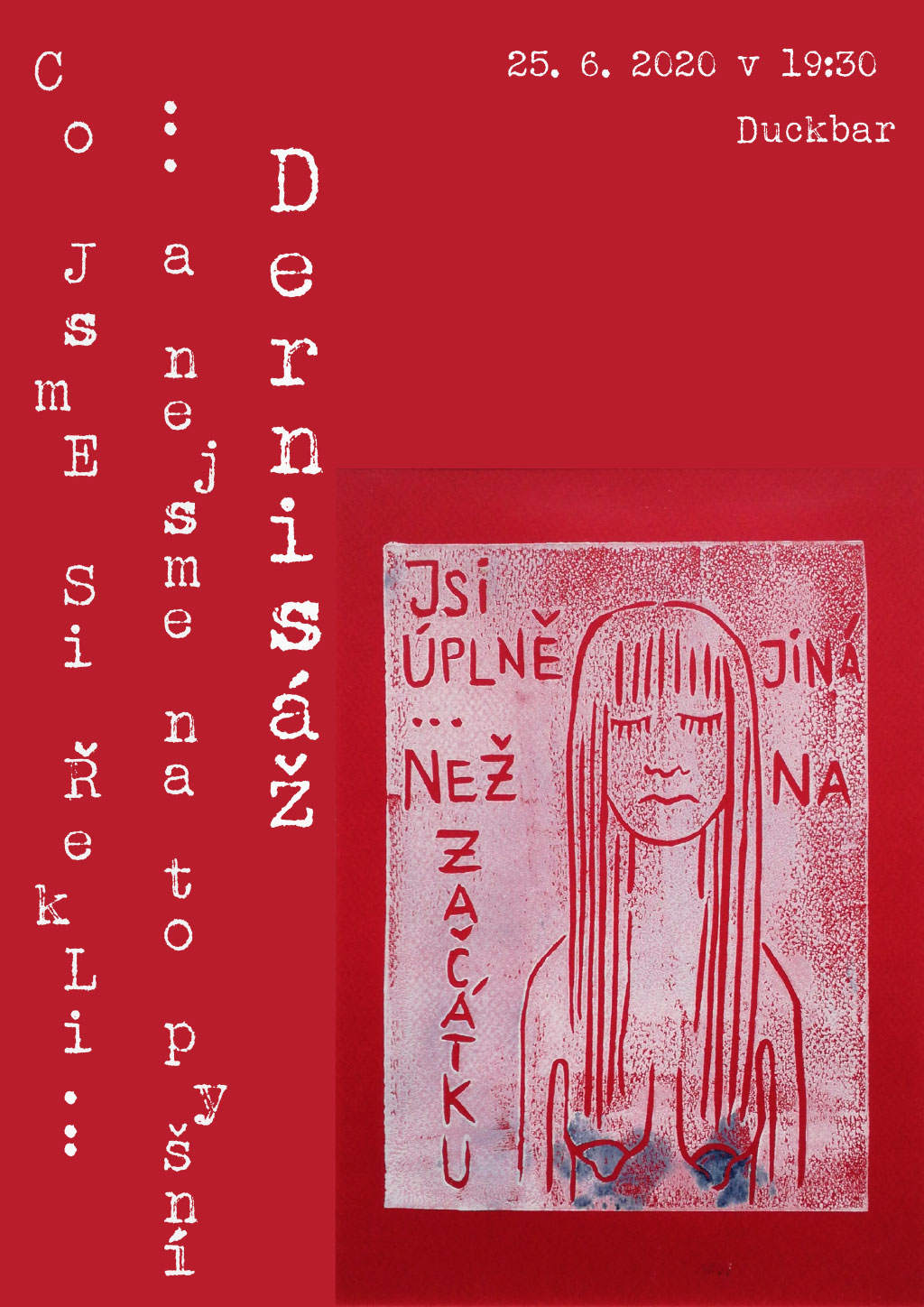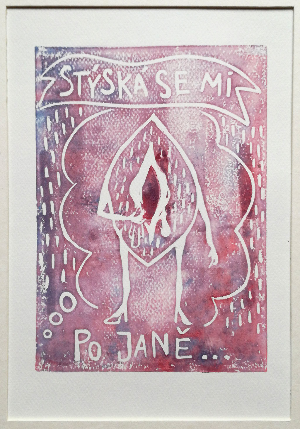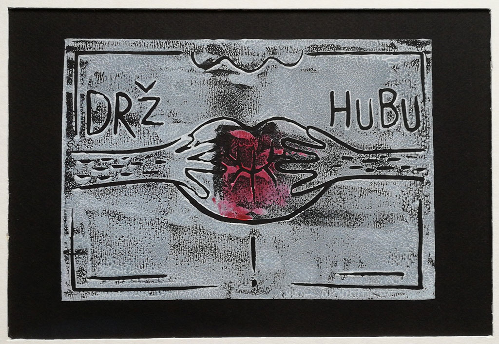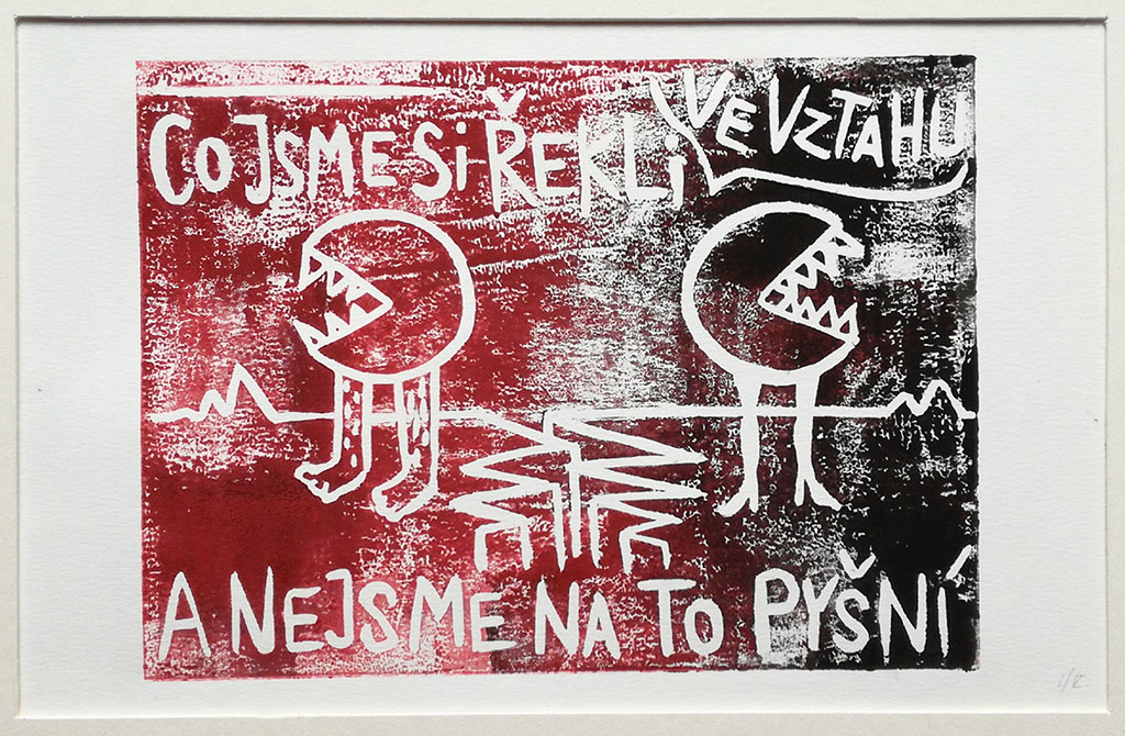 Vystavené linoryty vznikly během jediného víkendu jako autoterapie bez jakékoli předchozí zkušenosti s tímto médiem. Impulsem byla hádka s partnerem, kterému tímto velmi děkuji za inspiraci, následnou omluvu a za barvy na linoryt.